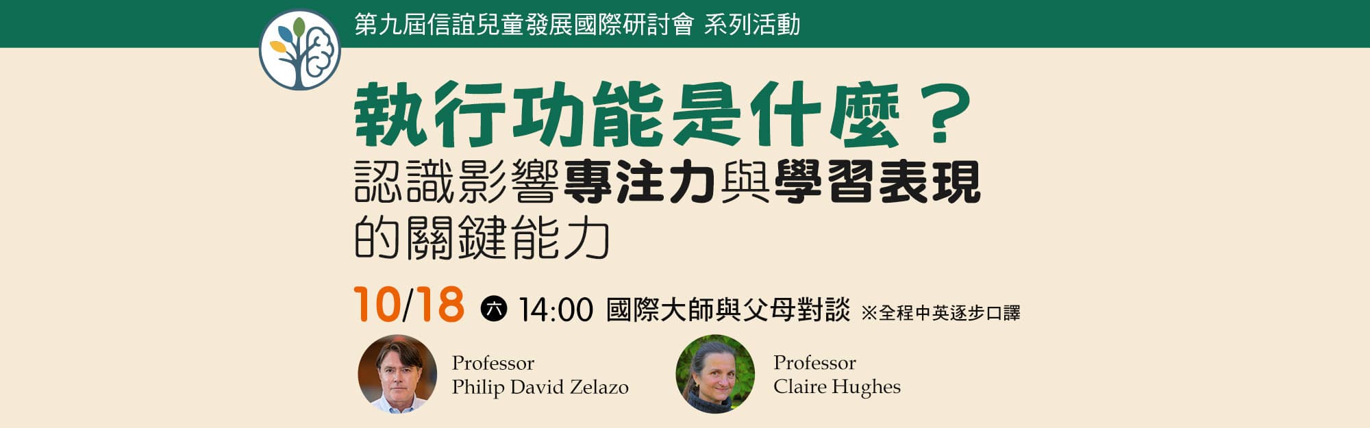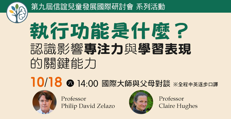| 14:05-16:05 | 如何全面促進孩子的執行功能? 【主講人】Professor Philip David Zelazo 上小學之前,如何建構執行功能與心智能力? 【主講人】Professor Claire Hughes |